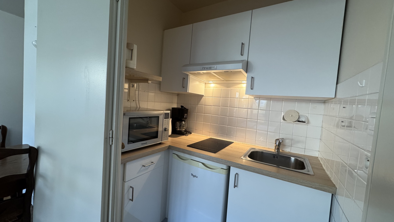 Avec une très belle vue dégagée sur jardin et montagnes, exposé Est, il est composé de : 1 entrée avec placard desservant : 1 pièce de vie avec kitchenette équipée et espace salon et nuit de 20m², balcon, 1 salle d'eau avec douche, wc et machine à laver et rangements.
