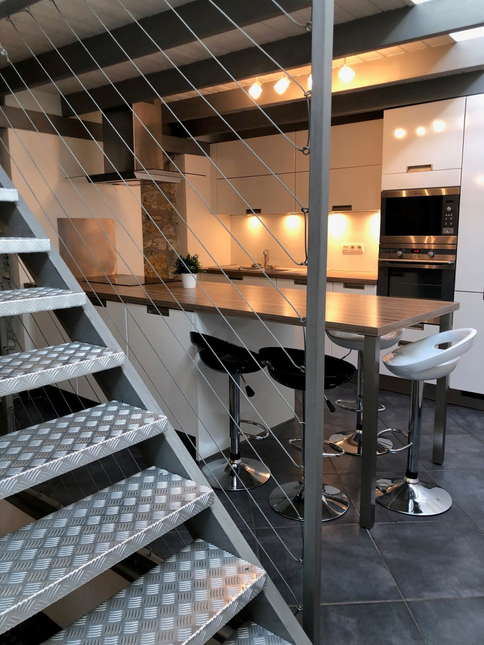 Ce loft original est est composé de plain-pied, d'une entrée avec placards coulissants, d'un grand salon avec une très belle cuisine américaine de 34m² (nombreux rangements). Eléctroménager en place : lave-vaisselle, réfrigérateur, congélateur, four, plaque induction, hotte.