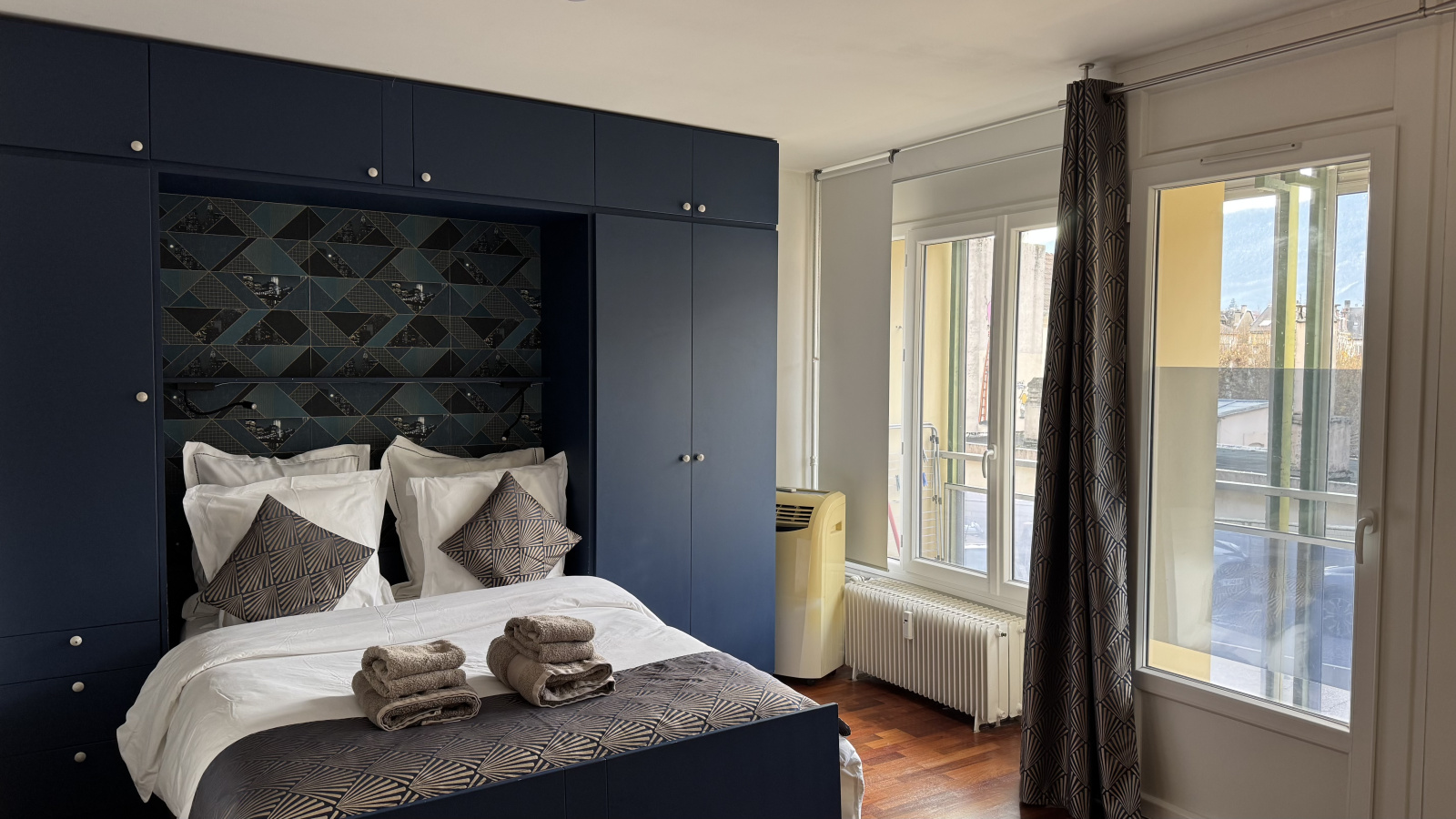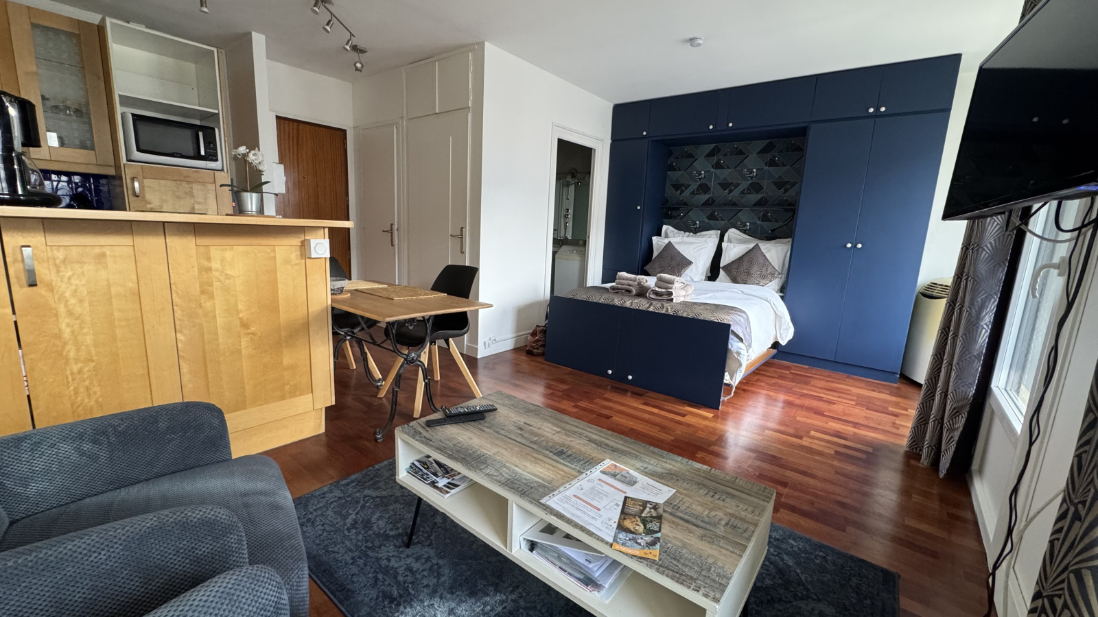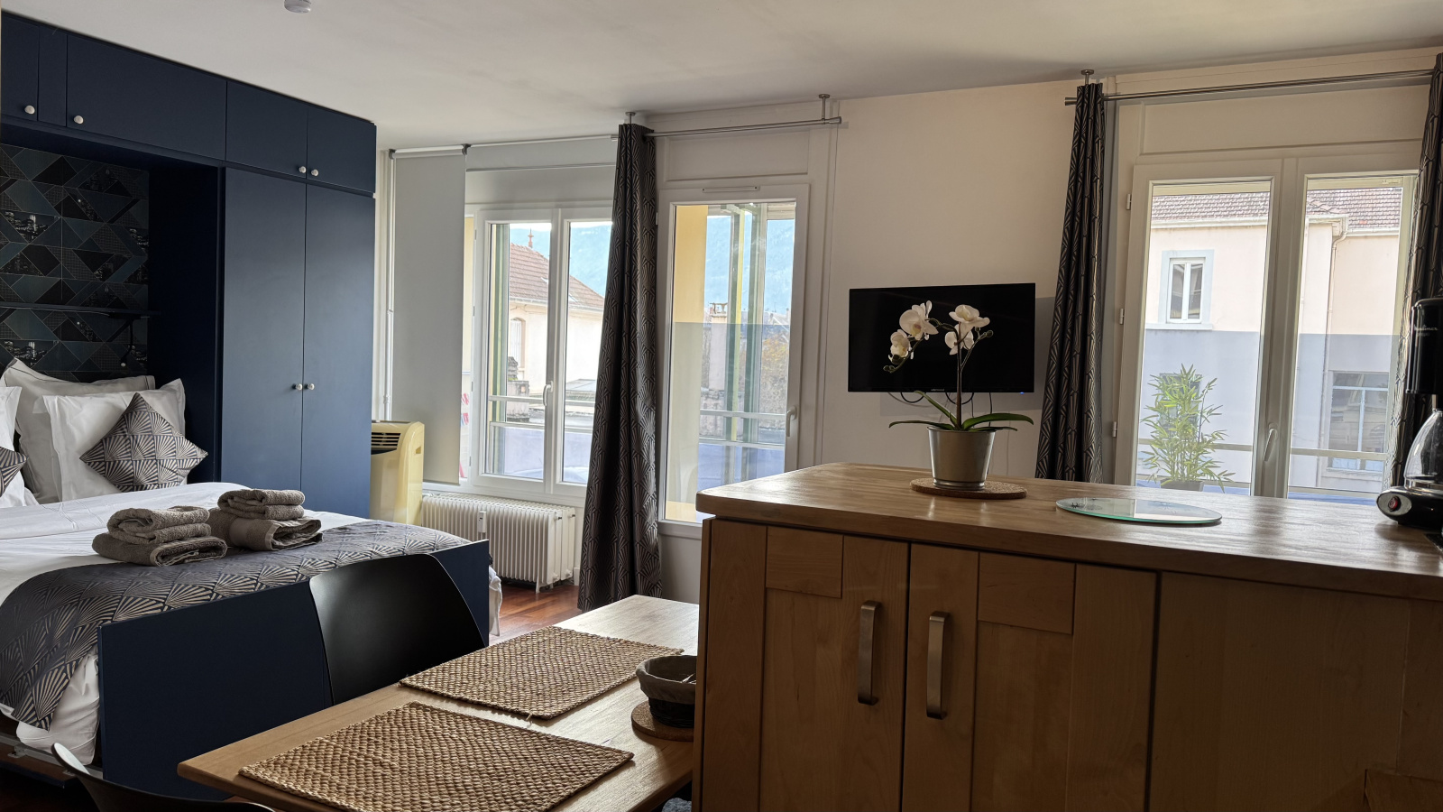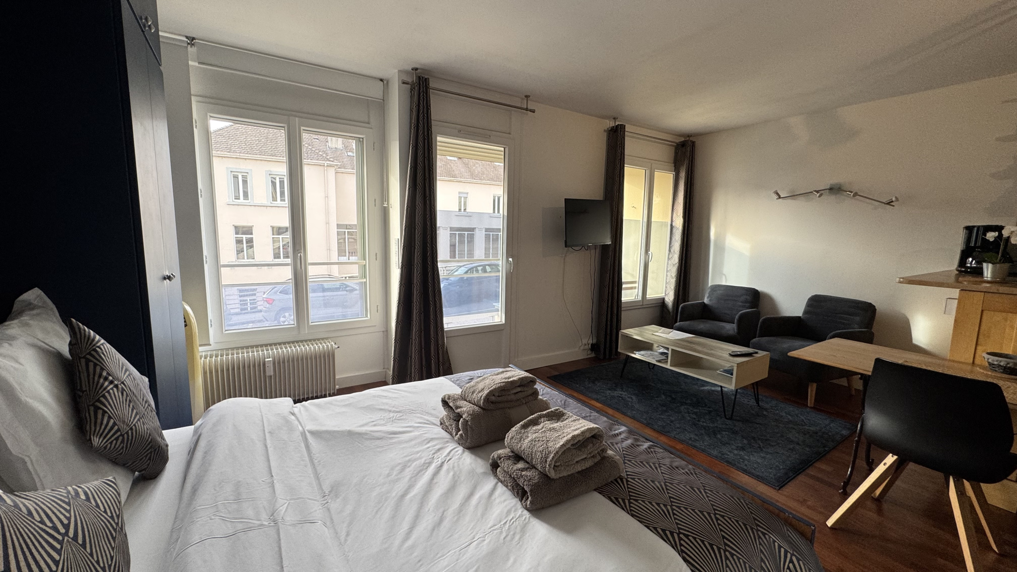 • Coin salon / séjour : deux fauteuils, une table basse, une télévision sur bras amovible, ainsi qu’un meuble de rangements, avec accès direct au balcon.