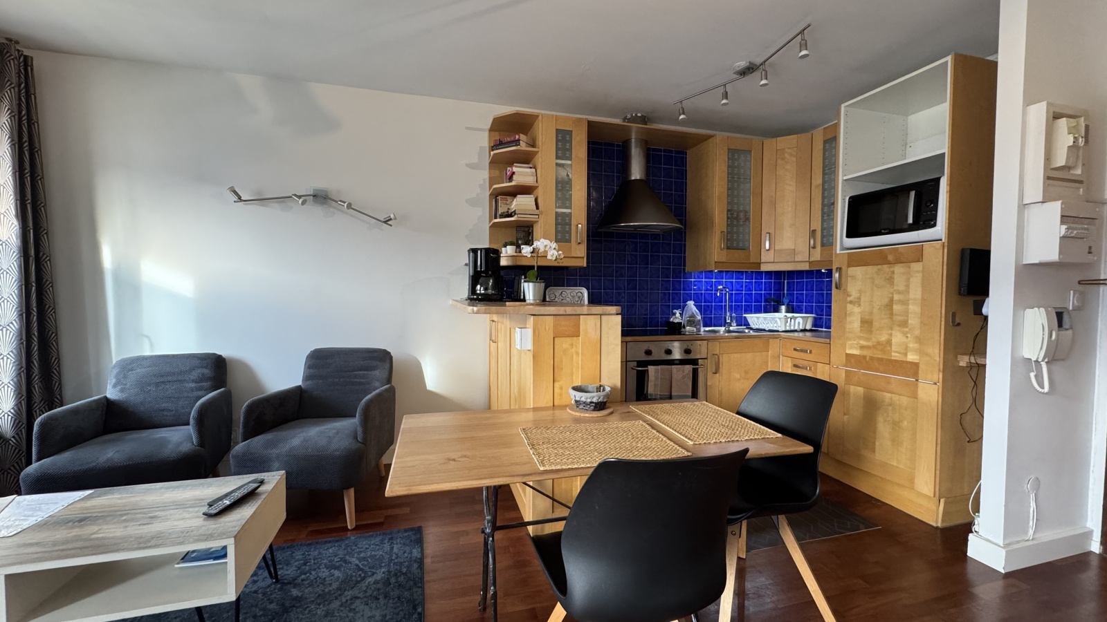• Coin cuisine (parquet et peinture) : meubles hauts et bas, évier avec égouttoir, plaque vitrocéramique 4 feux, hotte, four, four grill / micro-ondes, réfrigérateur avec freezer, lave-linge, cafetière filtre, bouilloire, grille-pain, vaisselle et ustensiles, table carrée et chaises.