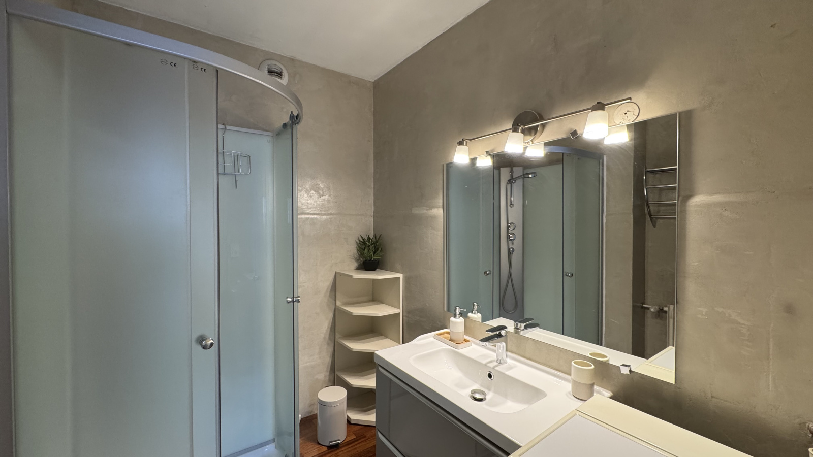 Une salle d’eau complète le bien, équipée d’une douche, vasque avec meuble, miroir, sèche-cheveux, radiateur sèche-serviettes ainsi que d’un lave-linge.