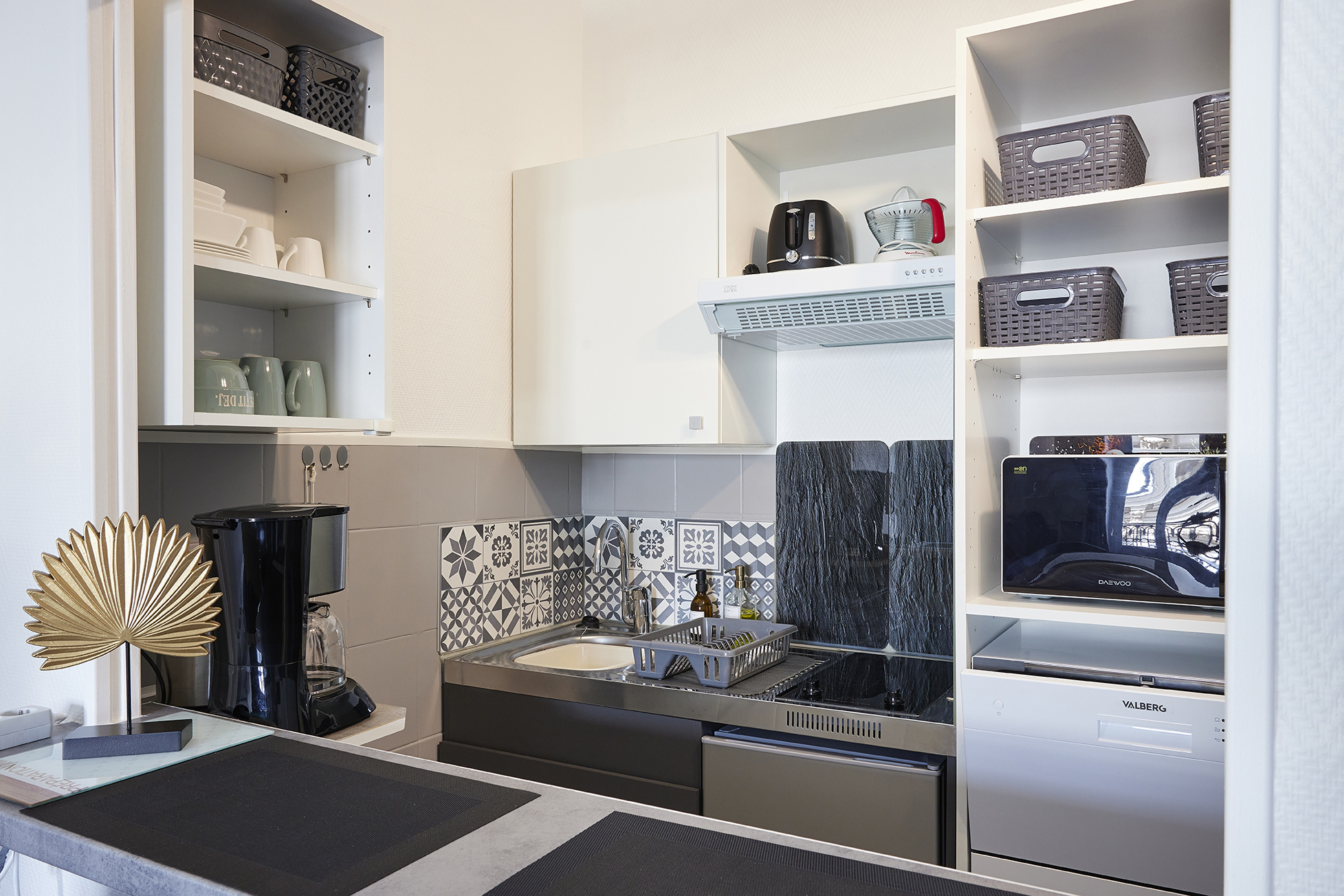 - Un espace cuisine aménagé et équipé (lave-vaisselle, four micro-ondes grill, réfrigérateur, table de cuisson induction, hotte, meubles hautes et bas...)